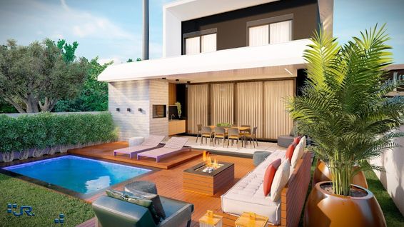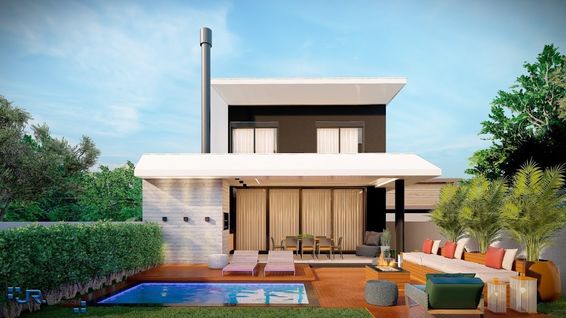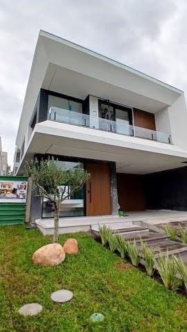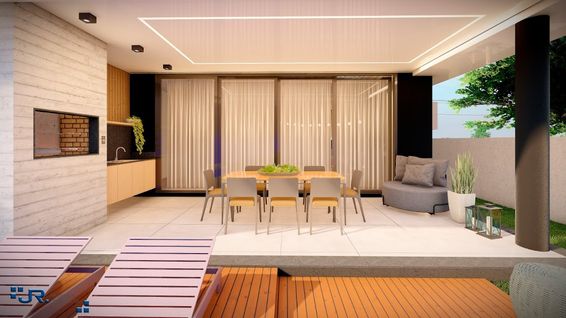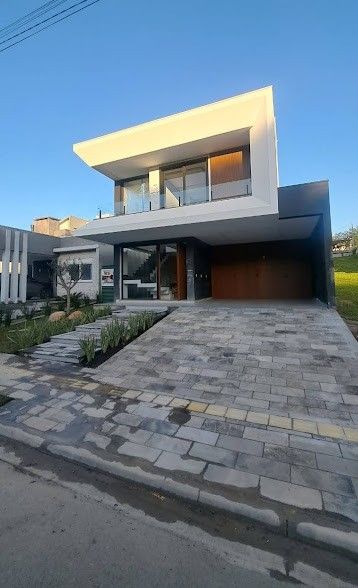Belíssima casa, com 230m², três suítes, living integrado, lareira, ampla área gourmet, garagem para dois veículos, home office, fire place e piscina de concreto.