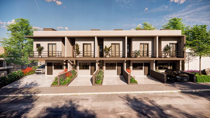 Sobrados modernos com ótima localização de 76 à 97m², com três dormitórios, sendo uma suíte, ambientes integrados, vaga de garagem em frente e pátio nos fundos.