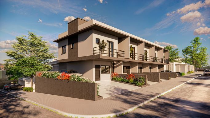 Sobrados modernos com ótima localização de 76 à 97m², com três dormitórios, sendo uma suíte, ambientes integrados, vaga de garagem em frente e pátio nos fundos.
